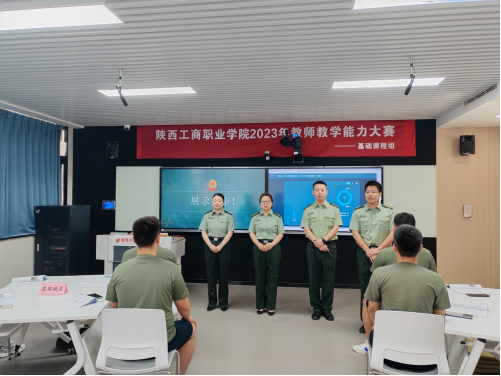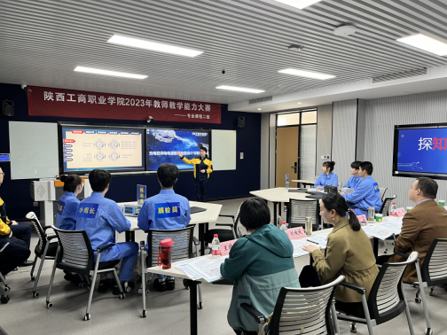 能力,4月1日,学校在郭杜校区智慧教室举办了2023年教学能力比赛。经二级学院初赛、学校网评复赛环节的筛选,26个教学团队进入决赛。决赛特邀15位校内、外专家担任评委,其中7位校外评委涵盖了国赛一等奖获得者、省赛评审专家。校长龙治刚、副校长吴宏梅现场指导,学校专兼职教师通过现场和在线方式观摩比赛。