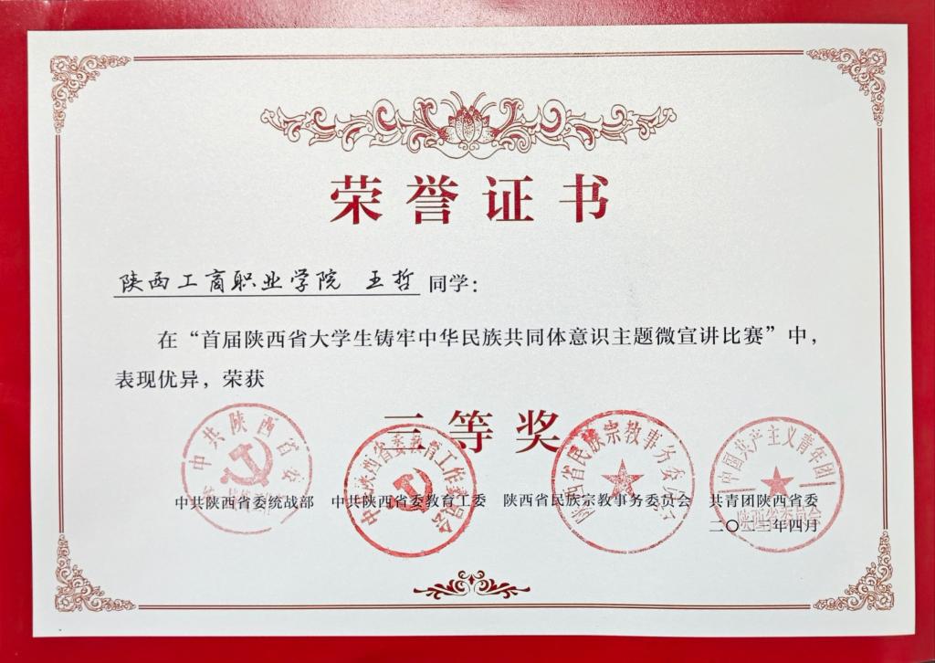 近日,由中共陕西省委统战部、中共陕西省委教育工委、陕西省民族宗教事务委员会、共青团陕西省委主办,西安交通大学承办的“深学细悟铸同心奋楫笃行谱新篇”为主题的首届“陕西省大学生铸牢中华民族共同体意识主题微宣讲展示活动”在西安举行。由学校党委统战部、团委选送,王霄云老师指导,信息与智能技术学院2021级学生王哲宣讲的作品《民族团结一家亲同心向党奔未来》获评三等奖。