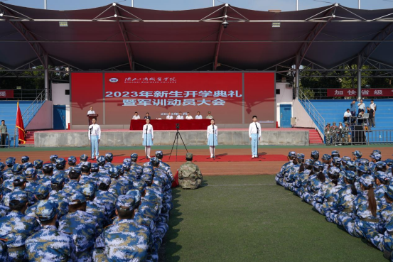 省级教学名师基础学院刘丽彬教授作为教师代表发言,2023级信息智能与技术学院,计算机应用技术专业的张嘉琦代表全体新生发言,承训部队首长作开训动员讲话,校领导为八名新生代表佩戴校徽。